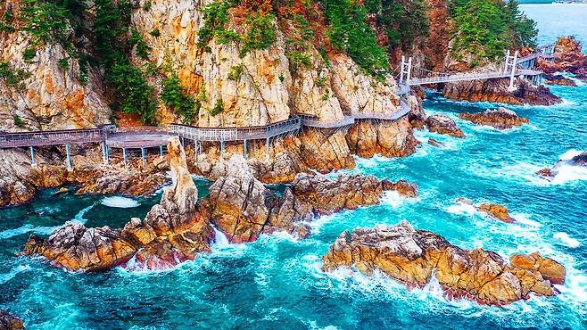 총 길이 660m의 산책로는 데크길 512m와 출렁다리 56m로 구성돼 있으며, 해안 절벽 위에 설치된 안전한 구조물 덕분에 남녀노소 누구나 쉽게 걸을 수 있다.