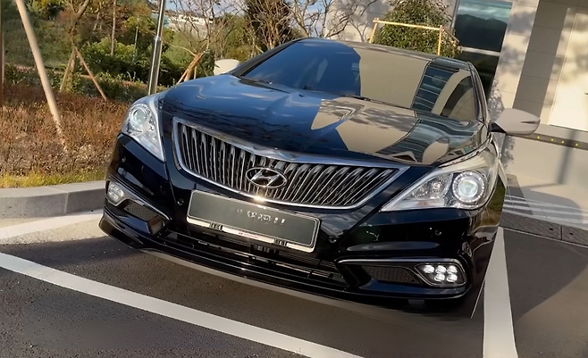 그래서 전면부 보시게 되면 날렵한 블랙 베젤의 HID 헤드 램프의 디자인이 비행체의 날개 같은 느낌을 좀 자아내는 것 같고 이 세로 형태의 그릴이 고급감을 조금 더 배가를 시켜주고 있거든요. 전기형 그랜저 HG의 가로 형태의 그릴이 소나타의 더 브릴리언트와 너무 닮아가지고 혼동이 된다는 불만사항이 많았었다 보니까 2013년형 모델로 오게 되면서 세로 형태의 그릴로 변경이 되면서 고급스러움과 스포티함까지 동시에 잡은 디자인입니다.