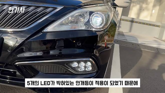 그리고 하단부 범퍼에 5개의 LED가 박혀있는 안개등이 적용되었기 때문에 전면부의 세련된 디자인을 완성시켜주는 것 같아요. 그리고 측면부 보시게 되면 준대형 세단에 와이드한 차체 크기를 뽐내주고 있는 것 같은데요. 17인치 바람개비 휠이라고 흔히 불리는 휠인데 저는 그 휠이 마음에 안 들고 상처도 그때 사왔을 때 좀 많았어서 15년 후기형 제일 마지막에 나온 18인치 휠로 업그레이드 했습니다.