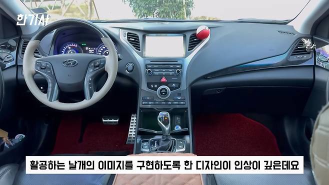 그랜저 HG 2.4 가솔린 18인치 휠을 기준으로 공인연비가 11.1km 정도 나오거든요. 근데 이 차량 하이브리드의 공인 연비가 약 16km 정도 나오기 때문에 동급 2.4 가솔린 대비해서 2.4 하이브리드의 연비는 확실한 장점인 것 같아요. 그리고 또 다른 장점은 저는 실내 디자인에서 가장 마음에 드는 부분, '웅장한, 위엄 있는'을 뜻하는 그랜드와 지면을 향하여 경사를 이루며 하강하는 '활공하다'라는 의미인 글라이드가 합쳐진 '그랜드 글라이드'의 컨셉을 바탕으로 웅장한 비행체가 활공하는 듯한 유려한 이미지를 담아내고자 했다고 하더라고요.