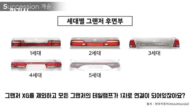 그리고 후면부 보시게 되면 그랜저만의 트레이드 마크인 좌우를 잇는 1자 형태의 테일 램프가 눈에 띄는 것 같은데요. 그랜저 XG를 제외하고 모든 그랜저의 테일 램프가 1자로 연결이 돼 있잖아요. 그렇기 때문에 테일 램프의 균형감이 굉장히 뛰어나고 하단부의 듀얼 머플러가 후면부 디자인의 안정감을 완성을 시켜주는 것 같아요.