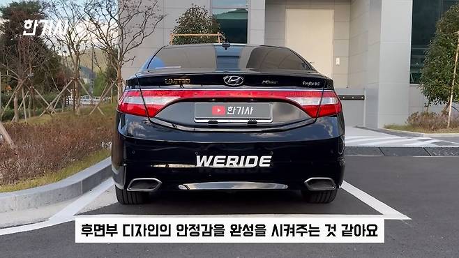 그리고 후면부 보시게 되면 그랜저만의 트레이드 마크인 좌우를 잇는 1자 형태의 테일 램프가 눈에 띄는 것 같은데요. 그랜저 XG를 제외하고 모든 그랜저의 테일 램프가 1자로 연결이 돼 있잖아요. 그렇기 때문에 테일 램프의 균형감이 굉장히 뛰어나고 하단부의 듀얼 머플러가 후면부 디자인의 안정감을 완성을 시켜주는 것 같아요.