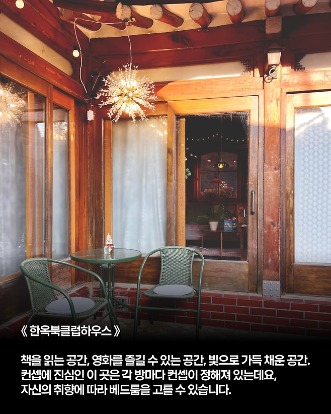 각 방마다 컨셉에 진심인 한옥 숙소, 한옥북클럽하우스입니다. 책을 읽는 공간, 영화를 즐길 수 있는 공간, 빛으로 가득 채운 공간으로 꾸며져 자신의 취향에 따라 베드룸을 고를 수 있는데요.