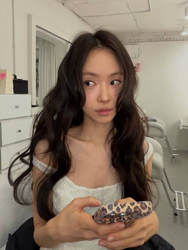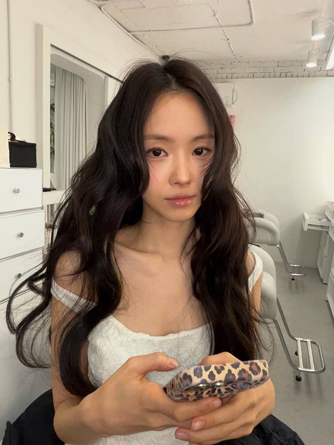 휴대폰을 쥐고 정면을 응시하는 무표정하면서도 깊이 있는 눈빛은 긴 웨이브 헤어와 어우러져 신비로운 느낌까지 전달하고 있어요.