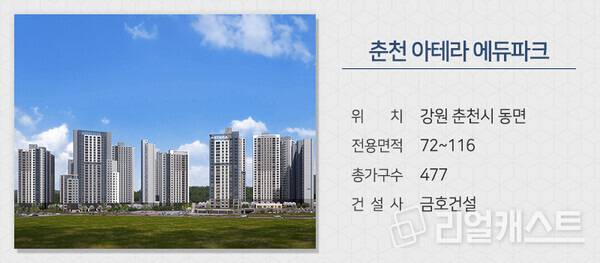 금호건설은 강원 춘천시 동면에서 ‘춘천 아테라 에듀파크’를 분양합니다. 게스트하우스, 어린이 물놀이터를 비롯해 지하에는 모든 세대가 이용할 수 있는 세대창고 등 차별화된 주민 편의시설이 장점입니다. 만천초교가 가깝고 강원중, 강원고, 춘천여고 등의 학군을 갖췄습니다.