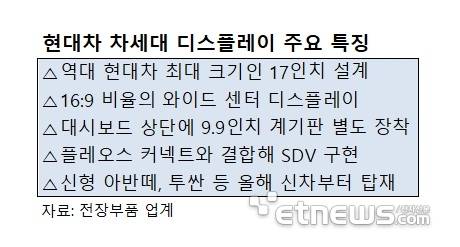 현대자동차가 올해 출시하는 신형 아반떼와 투싼 등 주요 신차에 역대 최대 크기인 17인치 디스플레이를 탑재한다.