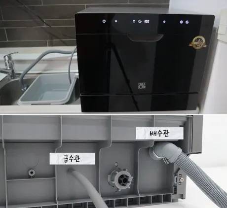 싱크대 상부에 있다보니, 식기세척기 내부에 물을 공급해주기 위해서는 급수관과 수도관이 연결 될 수 있도록 싱크대 상부에 타공을 해야합니다.