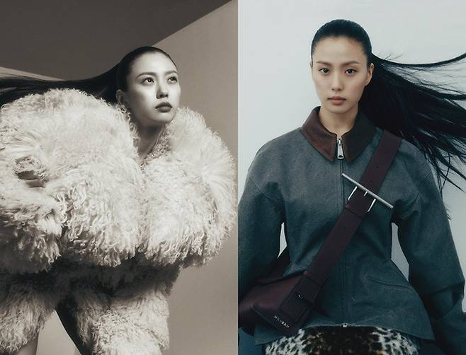 이번 화보에서는 과장되게 부풀린 칼라가 특징인 내추럴 시어링 코트룩이 원초적인 무드를 담아내며 시선을 사로잡는다.