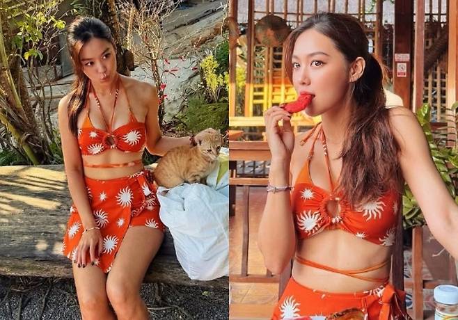 이날 김희정은 강렬한 주황색 비키니를 착용하고 성숙하면서도 세련된 분위기를 드러냈다. 여기에 자연스럽게 묶은 헤어 스타일링으로 청순한 매력을 더했다.