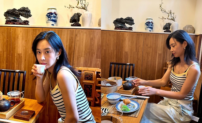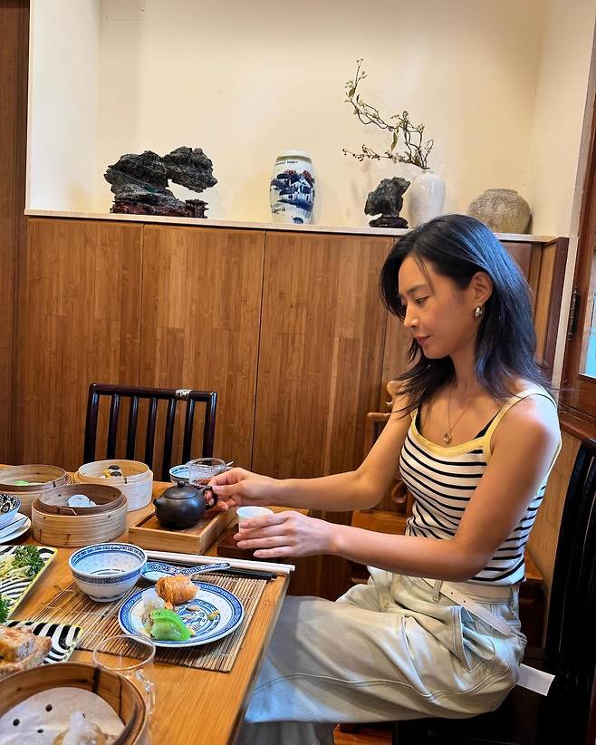 사진 속 유리는 스트라이프 나시티와 청바지를 입고 캐주얼한 룩으로 홍콩여행을 즐겼다.
