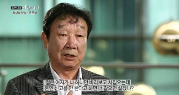 윤문식은 “딸이 처음에 혼인신고를 하지 말라고 그러더라. 그래서 '젊은 여자가 나 하나만 바라보고 시집오는데 혼인신고를 안 한다고 하면 너 같으면 살겠냐?'라고 했었다”라고 말문을 열었습니다.