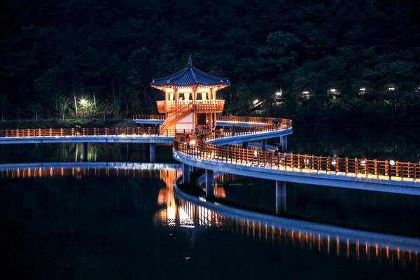 옥연지 위를 태극 모양으로 가로지르는 백세교를 건너면 야경을 즐기며 둘레길 산책을 할 수 있습니다. 백세교는 이름 그대로 무병장수를 기원하는 다리입니다. 다리 중앙에는 옥연지의 풍광을 한눈에 볼 수 있는 백세정이 있어 쉬어갈 수 있습니다.