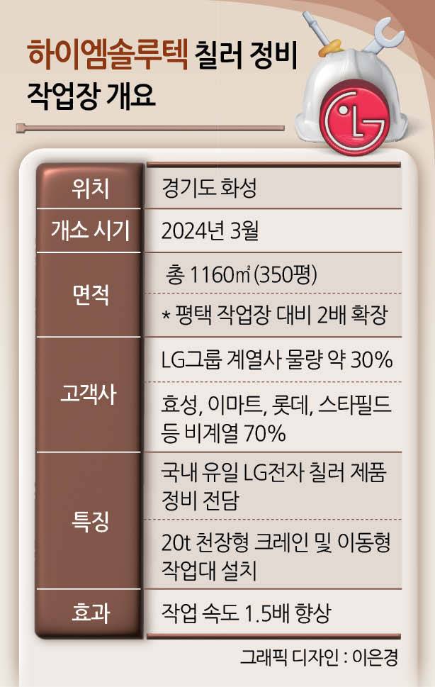 하이엠솔루텍은 LG전자의 칠러 설치부터 성능 진단 및 고장 해결 등 유지·보수·정비 전반에 걸쳐 서비스를 제공하며 대형 냉방설비의 안정적인 운용을 뒷받침하고 있다. 여기서 발생하는 매출은 칠러팀 전체 매출의 약 35%를 차지한다. LG그룹 각 계열사 공장에서 사용 중인 칠러들도 정비를 위해 이곳 화성 작업장으로 들어오지만 그 비중은 생각보다 크지 않다.