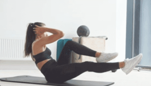 매트에 엉덩이를 대고 앉은 뒤, 상체를 뒤로 약간 젖히고 다리를 공중에 뻗어 V자 자세를 만듭니다. 손은 머리 옆으로 두고, 왼쪽 무릎을 당기며 상체를 비틀고, 이어서 오른쪽 무릎을 당기며 상체를 비틉니다.