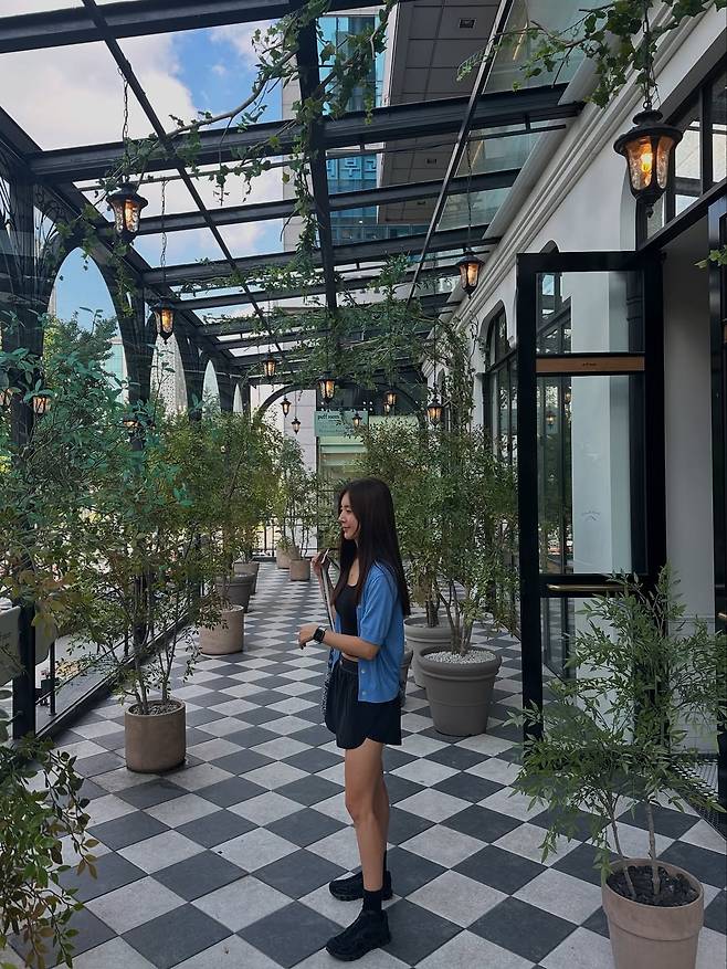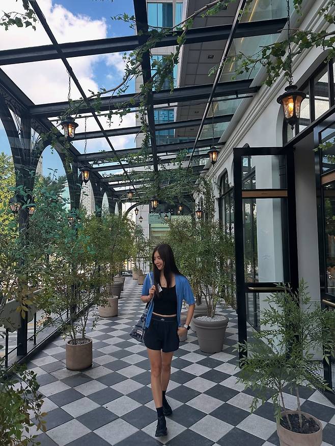 체크무늬 바닥 타일 위를 걷는 한채아의 모습은 마치 패션 화보의 한 장면 같습니다.
