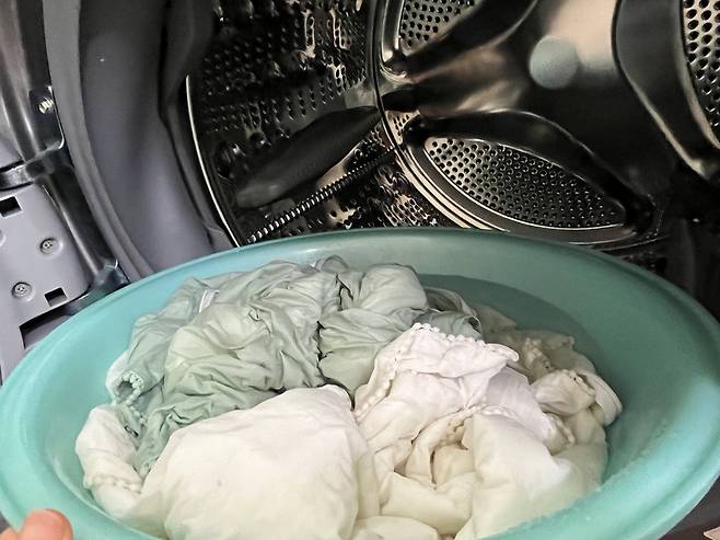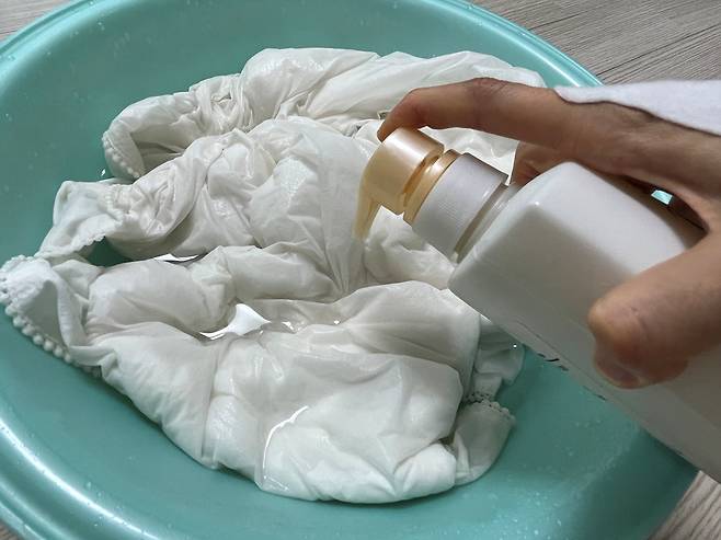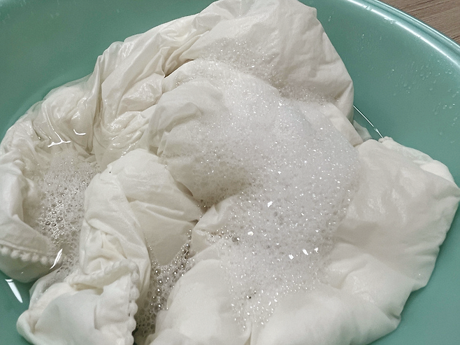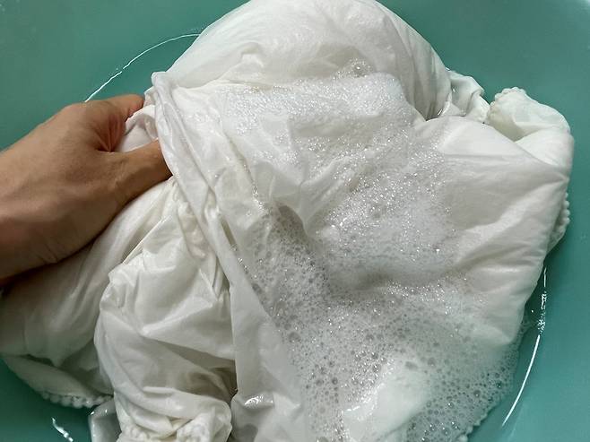 특정 부분 얼룩이나 오염이 있다면 손으로 문질러서 제거해주세요. 만일 큰 때가 없다면 이 상태에서 나머지 과정은 세탁기로 처리하면 됩니다. 물론 손빨래를 통해 세탁해도 상관없습니다.
