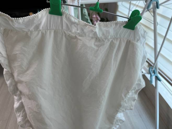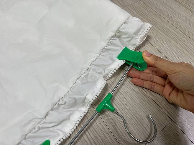 탈수까지 끝난 베개 커버는 바지걸이에 걸거나 건조대에 걸어서 물기를 말려 줍니다.