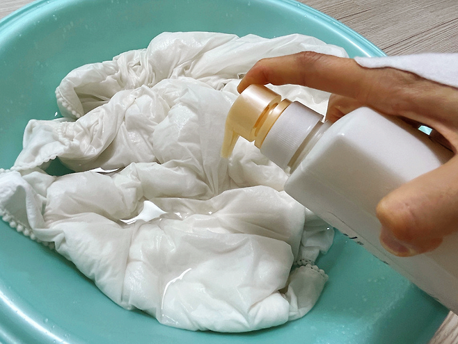 베개 커버는 미지근한 물에 푹 담가주세요. 그다음 샴푸를 1회 펌핑합니다. 베개 커버는 일반 세탁 세제대신 샴푸를 활용하면 쉽고 효과적으로 세탁할 수 있습니다.