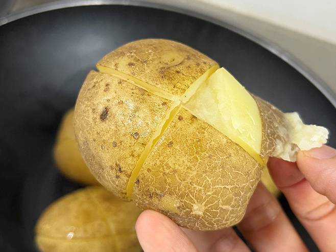 중간에 한 번씩 감자를 뒤집어 앞면과 뒷면이 골고루 익도록 합니다. 감자가 거의 익었으면 불을 끄고 잠시 식힙니다.