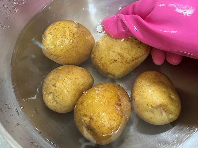 감자는 겉면을 문질러서 흙과 먼지 등을 제거합니다. 깨끗하게 씻은 감자는 껍질째 쪄서 먹어도 맛있습니다.