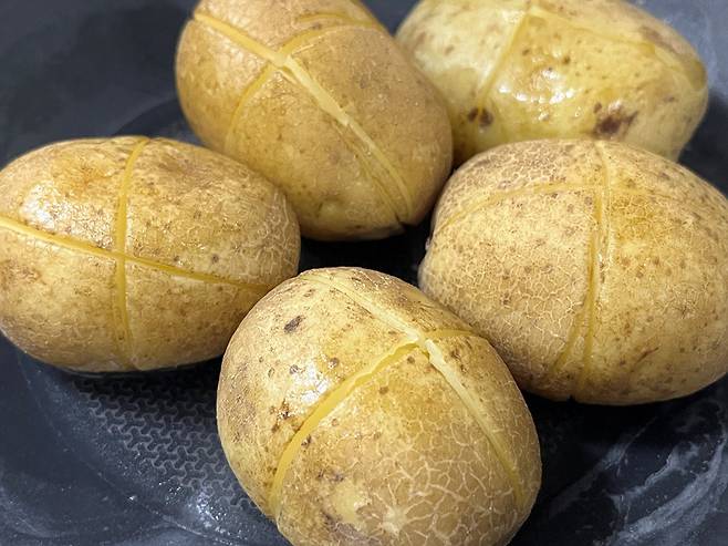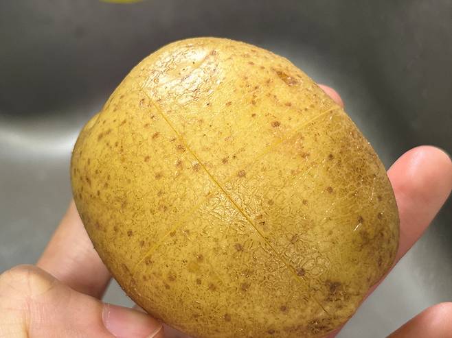 깨끗하게 세척한 감자에 열십자로 칼집을 냅니다. 한쪽 면만 내는 것이 아니라 감자 전체를 빙 둘러서 칼집을 내세요.