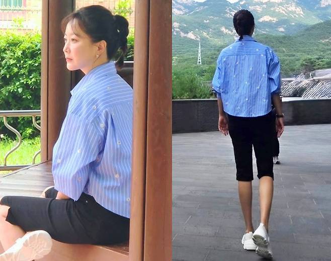 배우 김희선이 푸른빛 셔츠와 경쾌한 스니커즈로 자연스러운 여름 감성을 담아냈습니다.