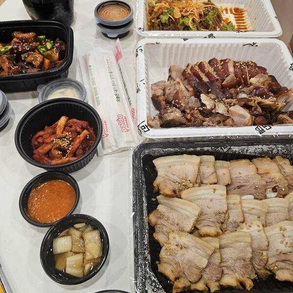 족발 자체는 삶은 고기이지만 문제는 그 위에 뿌려지는 소금, 마늘소스, 쌈장, 그리고 막국수입니다.