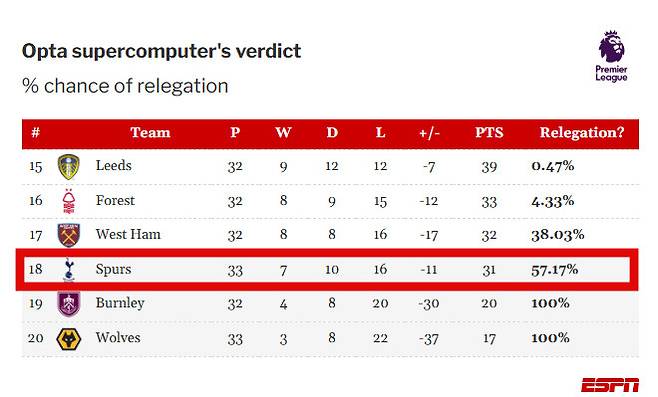 글로벌 스포츠 매체 'ESPN'의 23일(한국시간) 보도에 따르면 축구 통계 매체 '옵타'의 슈퍼컴퓨터는 토트넘의 강등 확률을 57.17%로 바라봤다.