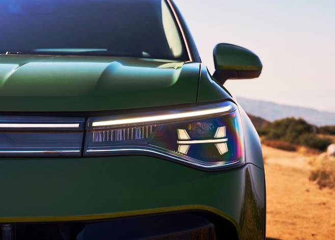2025 폭스바겐 타오스는 공격적인 프런트 범퍼와 더불어 대담한 크기를 자랑하는 흡입구 크기를 자랑하는데 그 외 폭스바겐을 상징하는 엠블럼을 중심으로 좌우 측으로 이어지는 주간주행등과 헤드램프 디자인은 얼핏 현대차, 싼타페와 닮은 듯한 인상을 주고 있어 폭스바겐 타오스의 새로운 디자인에 대한 국내 소비자들의 거부감은 적을 것으로 전망됩니다.