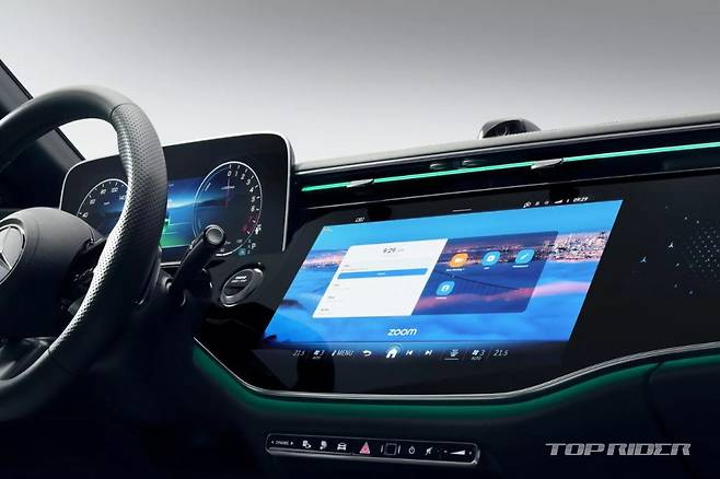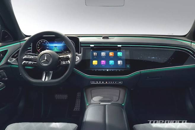 벤츠는 E클래스 풀체인지 실내를 22일(현지시간) 공개했다. E클래스 풀체인지 실내에는 디지털 계기판, 센터페시아 디스플레이와 조수석 디스플레로 구성된 MBUX 슈퍼 스크린 등이 적용됐다. 특히 셀프 카메라, 틱톡(TikTok), 줌(Zoom) 등을 지원한다. 상반기 중 공개된다.
