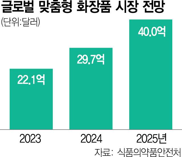 맞춤형 화장품 시장이 커지는 만큼 화장품 ODM 업계의 AI 기술 경쟁도 더욱 활발해질 것으로 보인다. 식품의약품안전처에 따르면 글로벌 맞춤형 화장품 시장 규모는 2020년 7억 5300만 달러에서 올해 29억 7500만 달러로 커졌다. 내년에도 34.6% 성장한 40억 달러 규모로 확대될 전망이다.