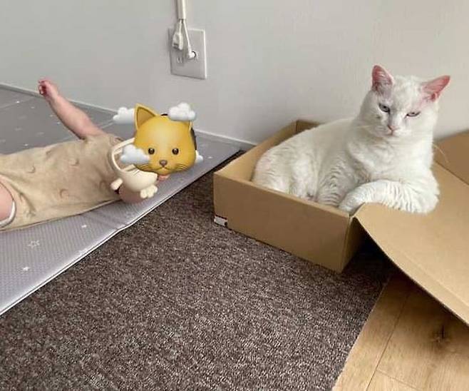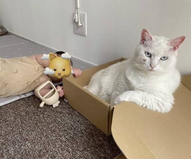 실제 공개된 사진을 보면 바닥에 누워 있는 아기 옆으로 고양이가 상자 속에서 시크한 표정을 지어 보이고 있는 것을 확인할 수 있었습니다.