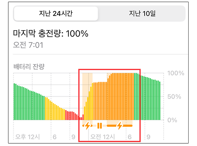 설정을 한 뒤 밤사이 충전을 하면 위 사진과 같은 그래프 모양이 나오게 된다. 초반 1~2시간은 충전 속도가 급속히 빠르다가 80%를 채운 새벽 시간에는 충전을 멈추고 기상 시간이 다가오면 100% 충전을 완료한다.