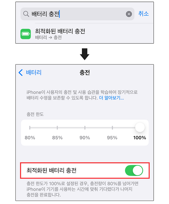 아이폰을 100% 충전 상태에서 오래 방치하면 배터리 수명에 안 좋은 영향을 주게 된다. 조금이라도 아이폰을 오래 사용하고 싶다면 '최적화된 배터리 충전' 설정을 켜자. 이 기능은 사용자의 충전 패턴을 학습해 충전량이 80%를 넘어가면 기상 시간에 맞춰 나머지 충전을 완료해 배터리 과충전을 최소화 해준다.