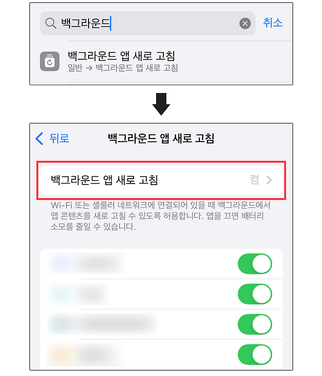 아이폰은 사용자가 쓰고 있지 않아도 배터리가 소모되는데 이유는 백그라운드 앱 새로 고침 때문이다. iOS가 아이폰에 설치된 앱과 실시간으로 데이터를 주고 받으며 앱을 최신 상태로 유지하면서 배터리를 사용한다.
