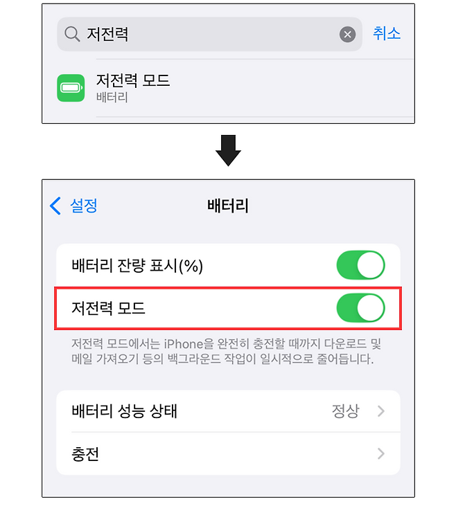 저전력 모드를 항시 켜는 방법도 있다. 저전력 모드를 활성화하면 백그라운드 활동, 시각 효과, CPU & GPU 성능, 클라우드 작업이 제한되어 배터리 소모를 줄여준다. 상시 충전이 여의치 않은 해외 여행에서 활용하거나, 자동화 루틴으로 배터리가 특정 퍼센티지 이하로 떨어지면 저전력 기능을 켜두는 것도 추천한다.