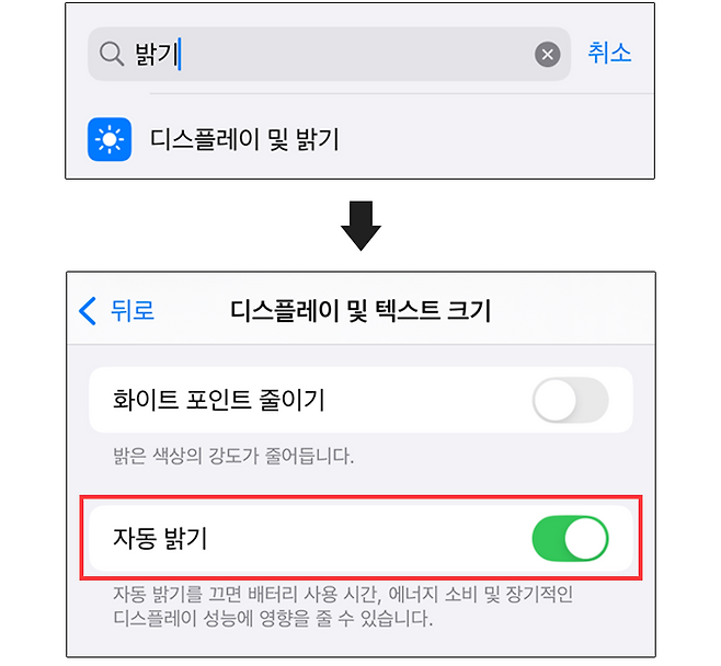 마지막 레슨이다. 아이폰 화면 밝기를 조절하는 것만으로도 배터리를 절약할 수 있다. 일반적으로 화면 밝기가 높은 상태에서 아이폰을 사용하면 배터리 소모가 급격히 많아진다. 그래서 '자동 밝기' 기능을 설정하면 주변 빛을 감지해 화면 밝기를 자동으로 조절하여 전력 소모를 줄여준다.