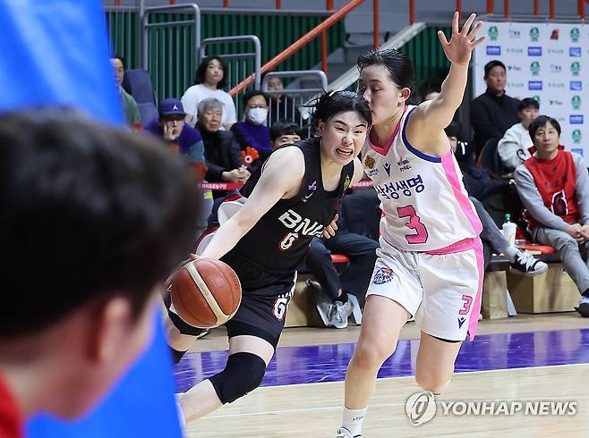 (부산=연합뉴스) 강선배 기자 = 5일 부산 사직체육관에서 열린 하나은행 2024~2025여자프로농구 플레이오프 2차전 부산 BNK 썸과 용인 삼성생명 블루밍스의 경기. BNK 이소희가 삼성생명 조수아의 밀착 마크를 뚫고 골 밑으로 파고들고 있다. 2025.3.5