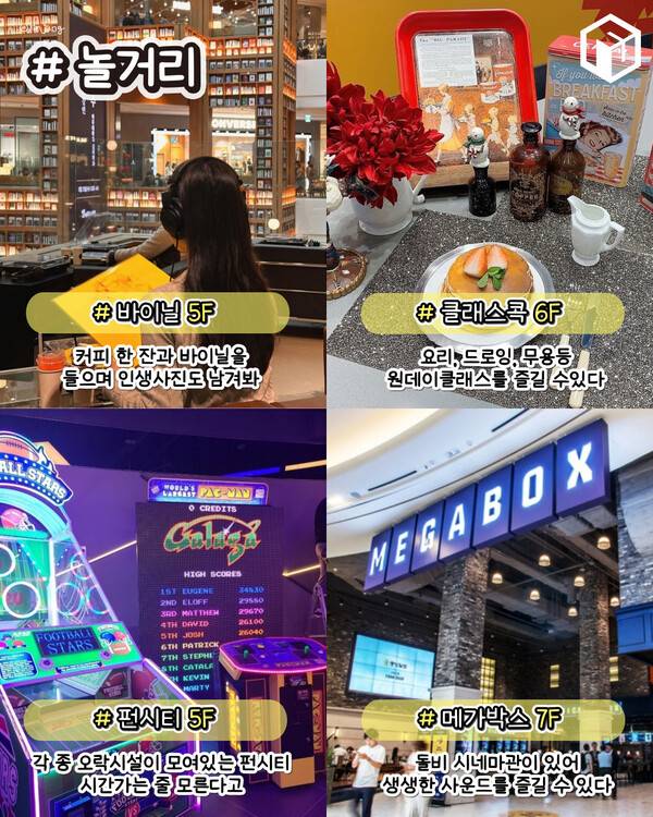 수원 스타필드에는 쇼핑과 먹거리외에도 다양한 놀거리가 많습니다. 스타필드 수원의 상징과도 같은 '별마당 도서관'부터 LP를 즐기며 별마당 도서관을 바라볼 수 있는 수원 스타필드의 최고의 뷰스팟인 ]바이닐'까지 다양합니다. 또 원데이클래스를 즐길 수 있는 클래스콕과 오락 시설인 펀시티까지 갖춰져있습니다.