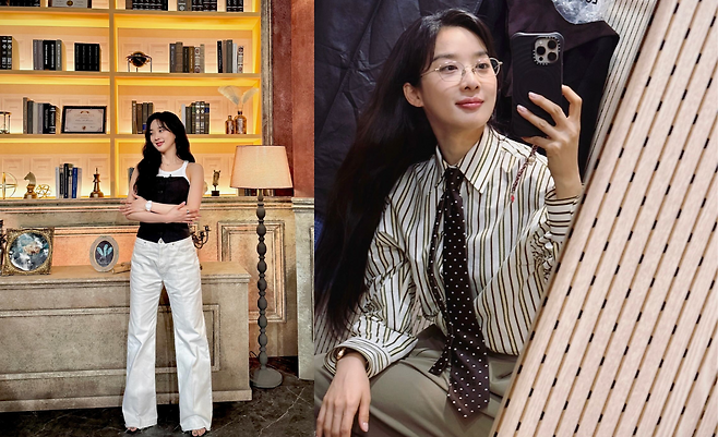 블랙 코르셋 톱에 화이트 와이드 팬츠를 조합한 대비가 돋보이는 스타일링을 선보이고 있다. 클래식한 서재 배경과 어우러져 우아하면서도 현대적인 감각을 드러내며, 블랙과 화이트의 조화로 세련된 페미닌 룩을 완성하고 있다.