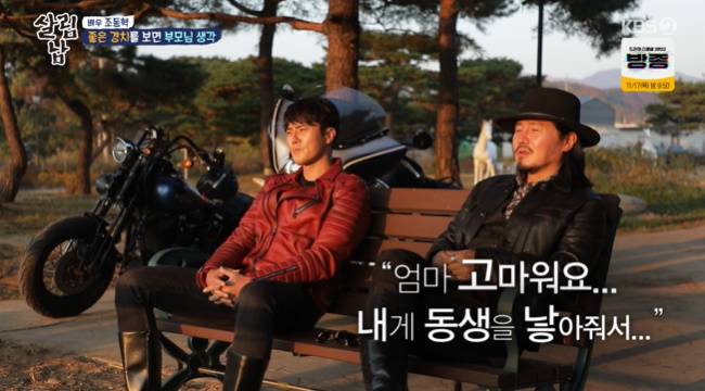 조동혁은 형과 함께 오토바이를 타면서 가을 풍경을 즐겼다. 형의 지인이 운영하는 카페에서 짧은 휴식을 취한 형제는 양평의 한 공원에서 나란히 앉아 노을이 지는 강을 바라봤다.