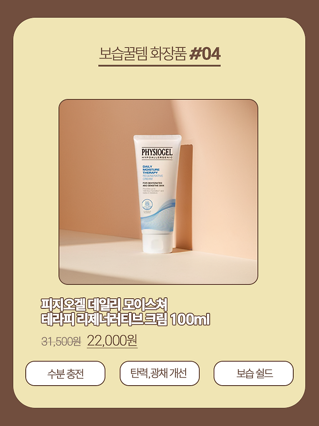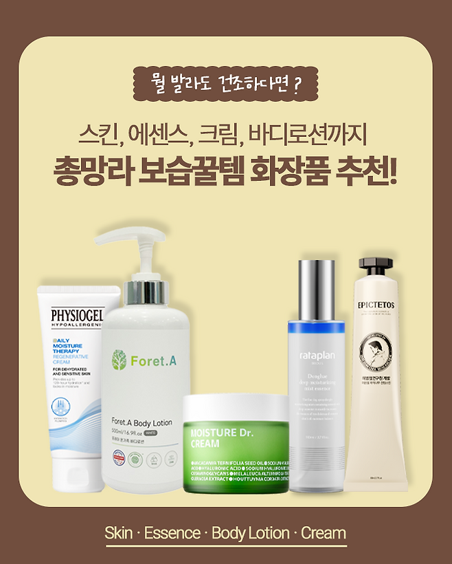 온 가족이 자극 없이 바디케어가 가능한 포레아 바디로션부터, 미네랄이 풍부한 동해 해양심층수가 함유되어 있는 라타플랑 동해 심층 미스트 에센스, 스킨 하나로 보습부터 미백 개선 등 토탈케어가 가능한 에픽테토스 진정 스킨, 피부 탄력부터 광채 및 보습까지 책임지는 피지오겔 데일리 모이스쳐 테라피 리제너러티브 크림, 믿고 쓰는 장수진(장벽, 수분, 진정) 크림인 아이소이 모이스춰 닥터 크림까지!