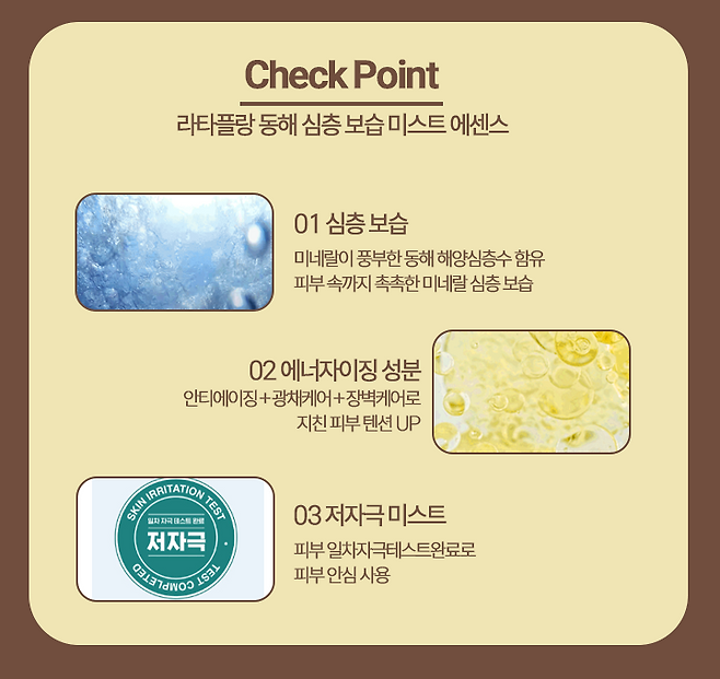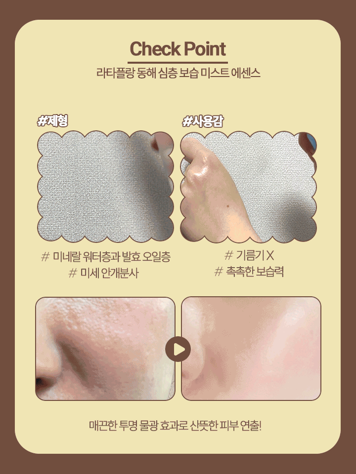 라타플랑 동해 심층 보습 미스트 에센스는 미네랄이 풍부한 동해 해양심층수가 함유되어 있기 때문에 자기 전에 뿌려도 아침까지 촉촉하게 유지가 가능하다.