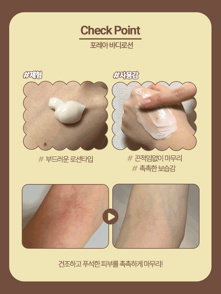 포레아 바디로션은 부드러운 로션 타입으로 부담 없이 모든 피부에 바를 수 있다. 끈적임 없이 산뜻하게 마무리되는 제형으로 마지막까지 촉촉하게 피부에 보습을 더해주는 점이 특히 좋았던 제품.