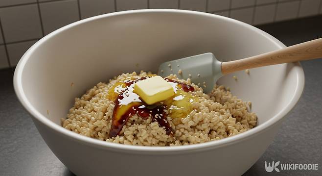 5. 밥 2공기에 버터 1/2큰술, 간장 1/2큰술, 참기름 1/2큰술을 넣고 잘 섞는다.