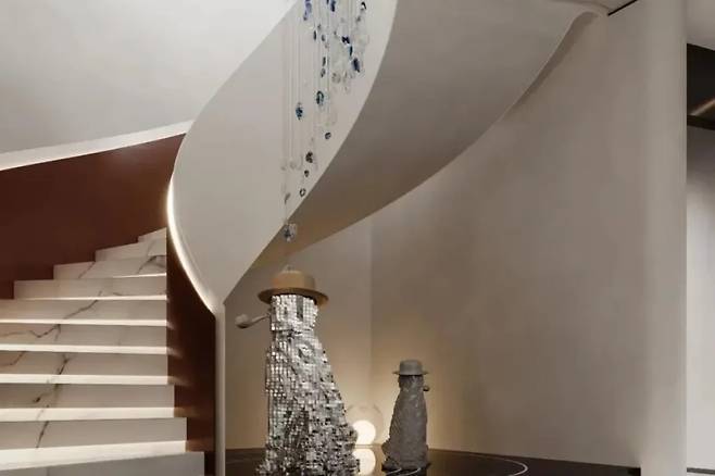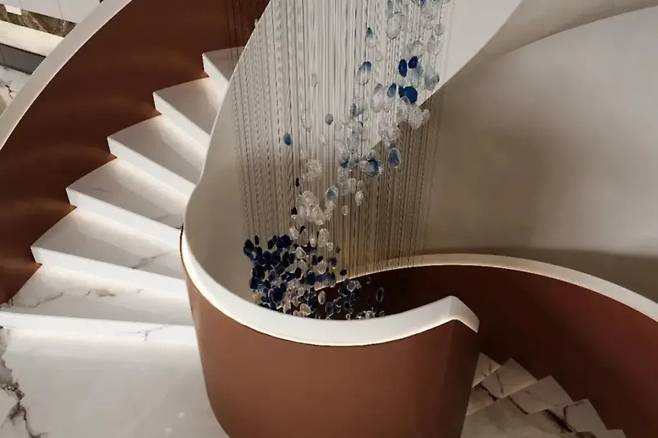 푸른색과 흰색의 샹들리에는 끊임없이 흐르는 물줄기를 연상시키며 공간에 활력을 불어넣습니다. 계단은 강바닥처럼 각 영역을 우아하게 연결하여 전체적으로 유동적인 공간을 구현합니다.