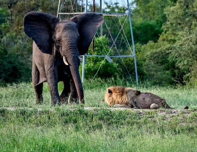 여기에 코끼리가 다가오자 쫓기는가 하면 몇 걸음도 제대로 걷지 못하고 결국 바닥에 쓰러지는 사자 스카이베드 스카였습니다.