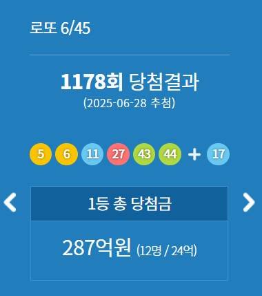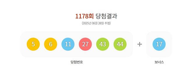 1๋ฑ ๋น์ฒจ๋ฒํธ: 5, 6, 11, 27, 43, 44