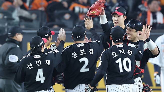 7-4로 역전승을 거둔 LG 선수들이 자축하고 있다.