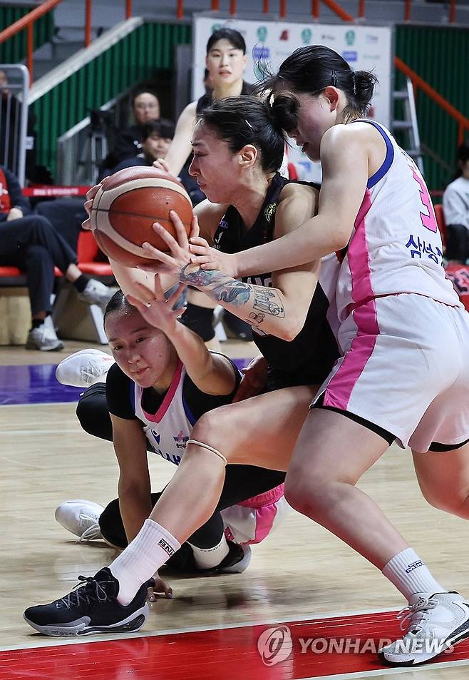 (부산=연합뉴스) 강선배 기자 = 5일 부산 사직체육관에서 열린 하나은행 2024~2025여자프로농구 플레이오프 2차전 부산 BNK 썸과 용인 삼성생명 블루밍스의 경기. BNK 김소니아가 삼성생명 조수아와 히라노 미츠키의 집중 마크당하고 있다. 2025.3.5